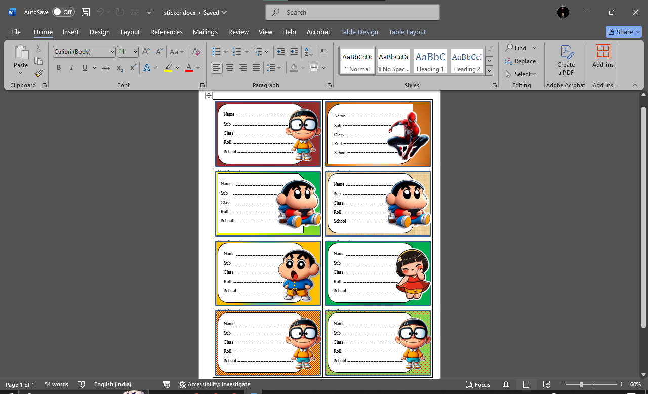 The result is a Name Slip Design Project in MS Word, where beautifully crafted slips with student details and cartoon images are displayed in a single printable sheet. Itโs a perfect example of creativity using basic Word tools.